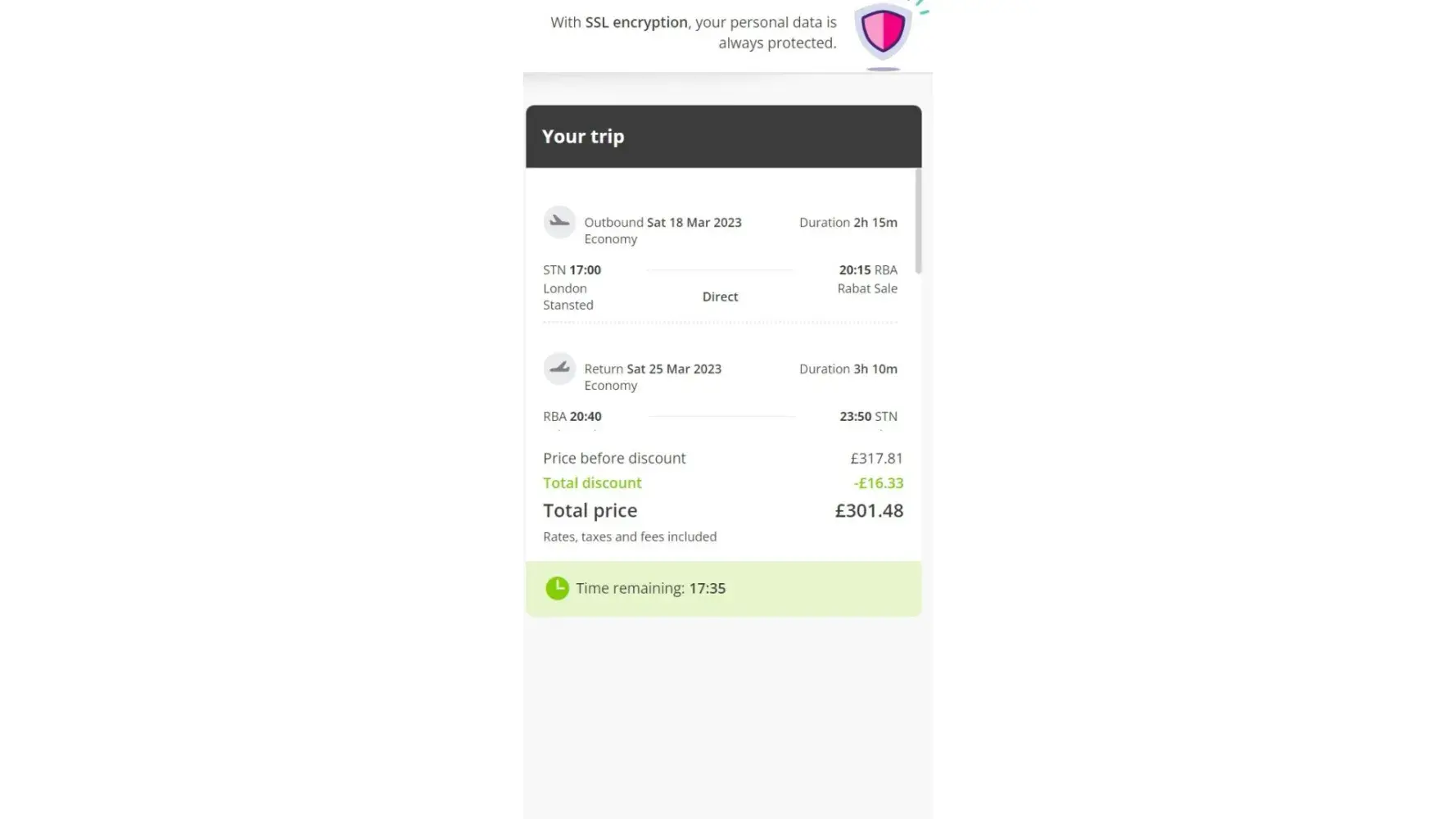 Then I made another request from London Stansted outbound on 18/03/2023 THIS TIME to (RBA) Rabat Sale (instead of TNG - Tangier Ibn Batouta as my previous booking}