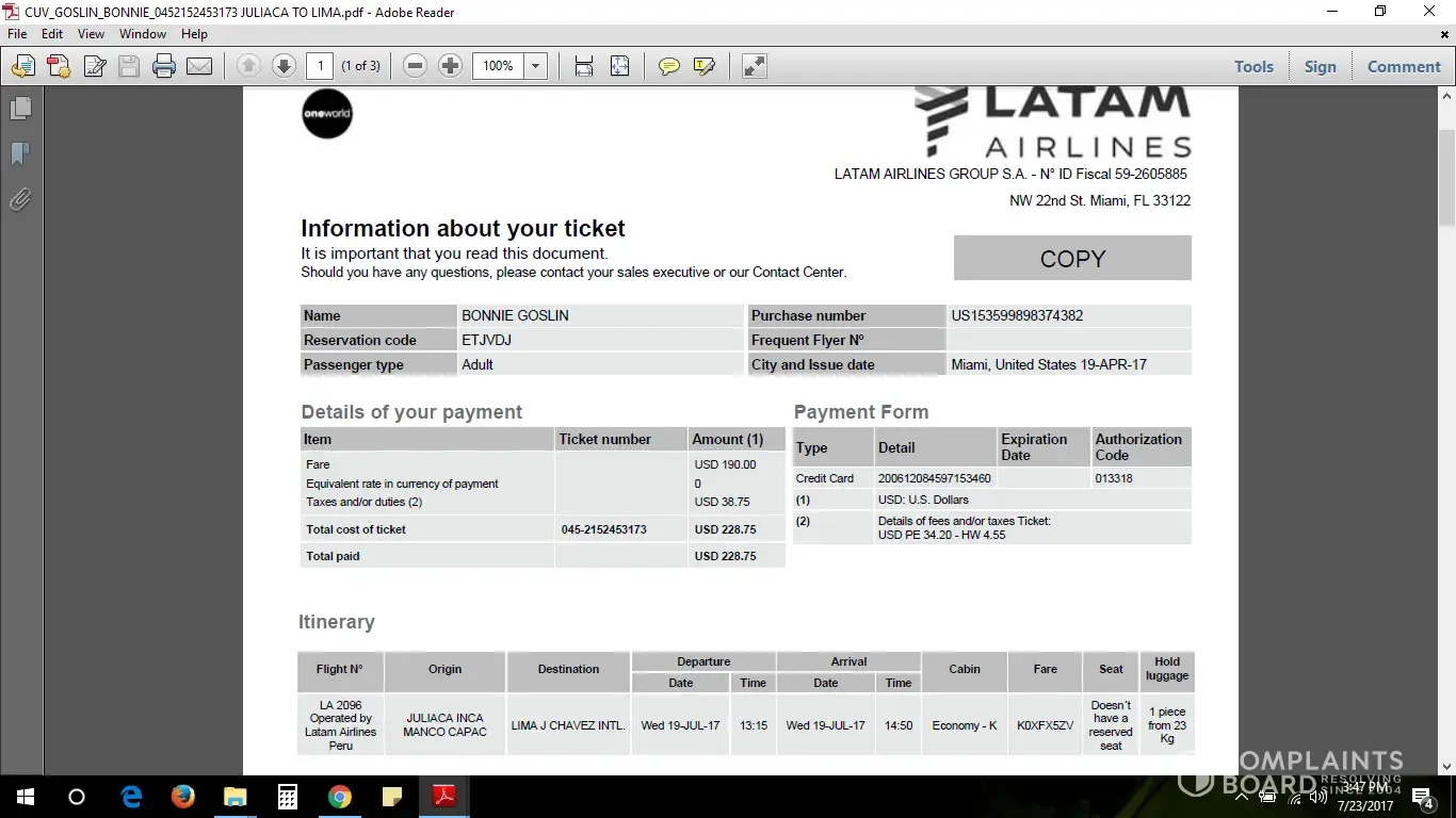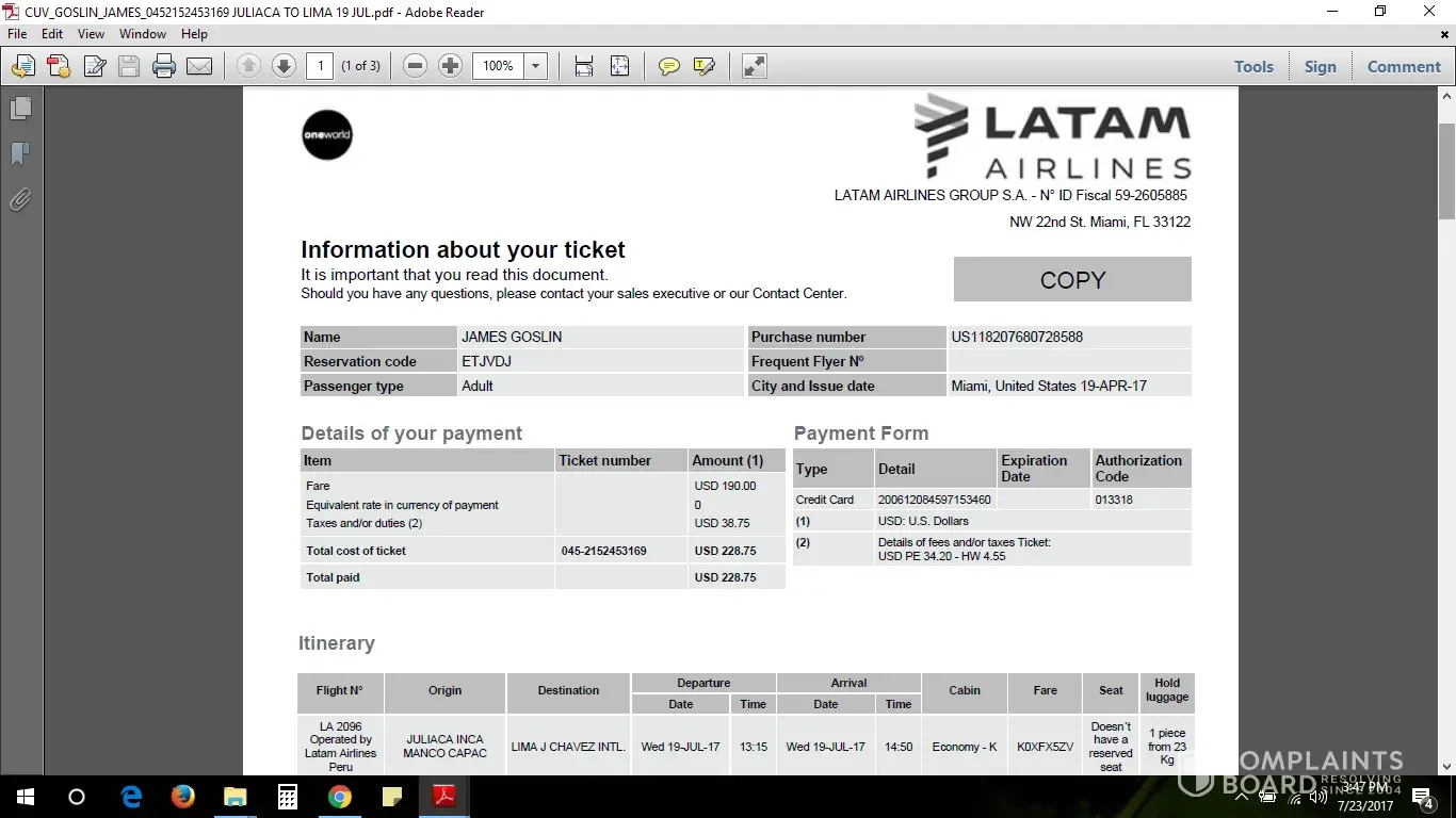 Our five original LATAM tickets to Lima from Juliarca were priced at US $228.75 each, or $1, 143.75 total, and our new tickets were priced at $305.16, or 1525.80.