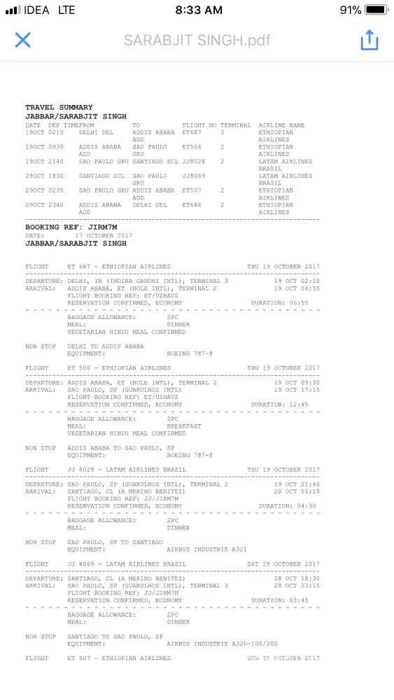 My self Sarabjit Singh Jabbar and my passport number is N5268607. I traveled with Ethiopian and latam airline from Delhi to Chile on dated 19/10/2017. My prime purpose was to come here to perform in the "seminaro de danzes Indo" and I was representing INDIA in this seminar, i was performing on 21/10/2017, but I am not able to perform in this seminar because my all costumes and the related stuff was in the baggage's that delayed by your airline .