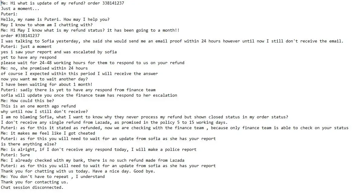 Lazada has been hiring a bunch of jokers as their Customer service represent. i had a issue too and mine was handled by different staff everyday, they make look like a dumb explaining each day with new staff. Lazada facebook is another bunch of idiots where the promise to reply in 1 - 2 working day but no reply and when i message, they ask me to wait again. Same goes to Lazada Singapore, so call the HQ. They were trained to be an idiots to repeat the same thing again and again.