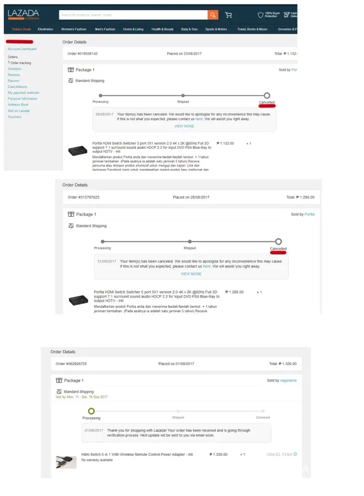 I have been ordering HDMI switcher for my TV since 2 weeks ago (Aug 23, 2017). I ordered bec Lazada says there is 1 stock left. But Lazada cancelled my order. They say there is no stock. Then I ordered another HDMI switcher. Again they say there is 1 stock left, again they cancelled it after a few days, saying there is no stock.
