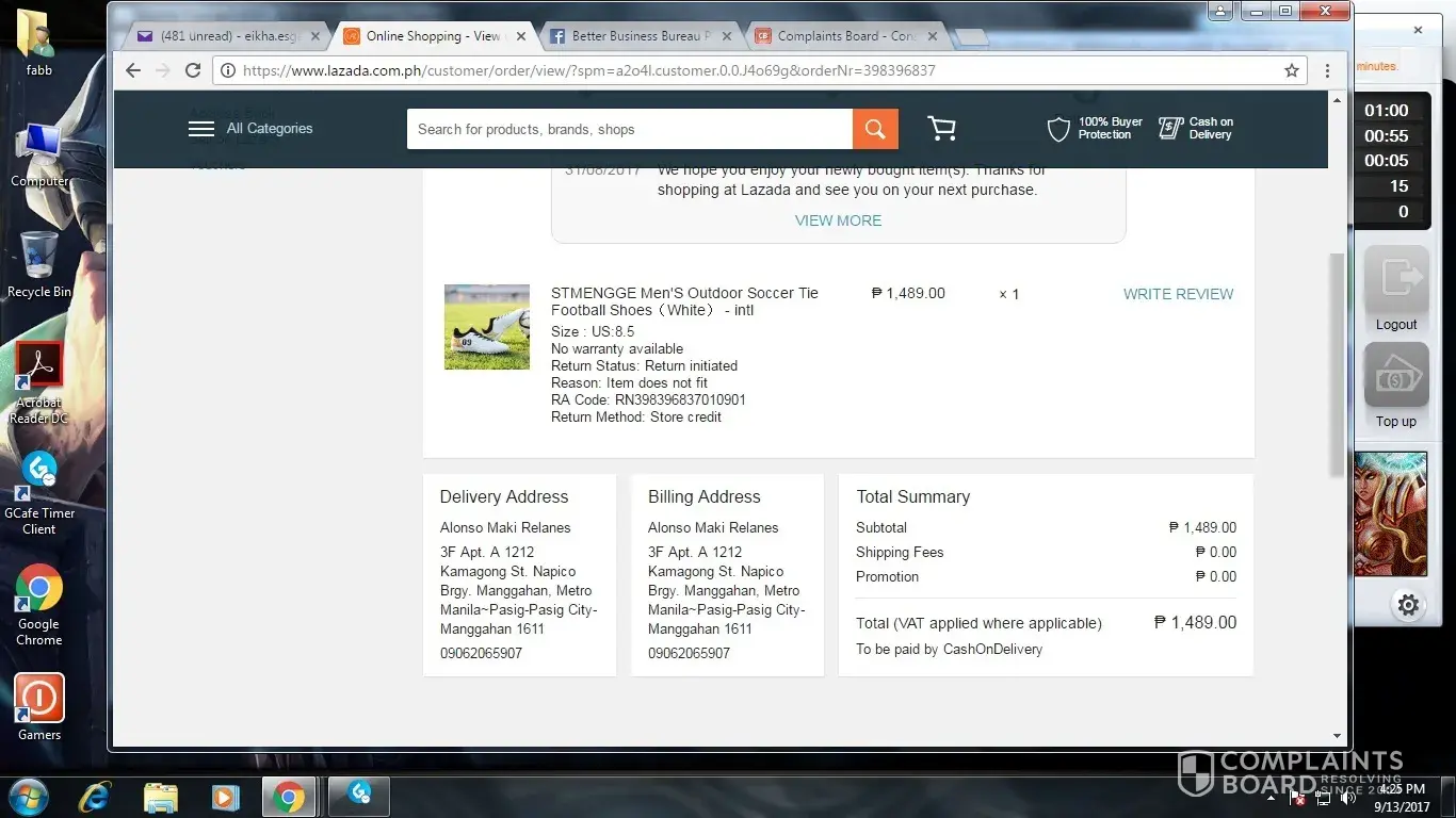 I would like to make a complaint about Lazada.ph. This is regarding my request for a refund that has been refused. I ordered a pair of football shoes that is shipped from abroad and I selected size 8.5 US on August 8, 2017 with an order number [protected]. Here are some of the details of my order: