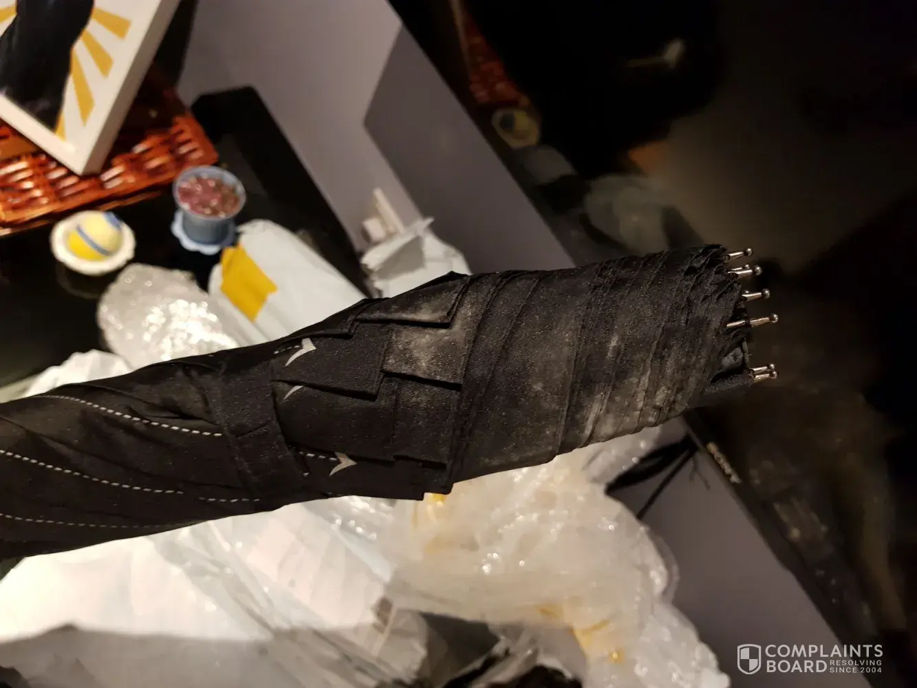 I have ordered 5 umbrellas in July, as part of an order over SGD700. I got emailed that 1 was out of stock and when the 4 umbrellas arrived, one of slightly damaged but usable and another was torn at the top (see pics), dirty (some sort of cement-looking powder in the bottom half), and with a scratched handle that would draw blood if repeatedly used as intended. This umbrella came in the same package as the others, but its individual wrapping lacked a handle bubble wrap - only the cloth portion had that - and was only covered in a thin plastic overall.