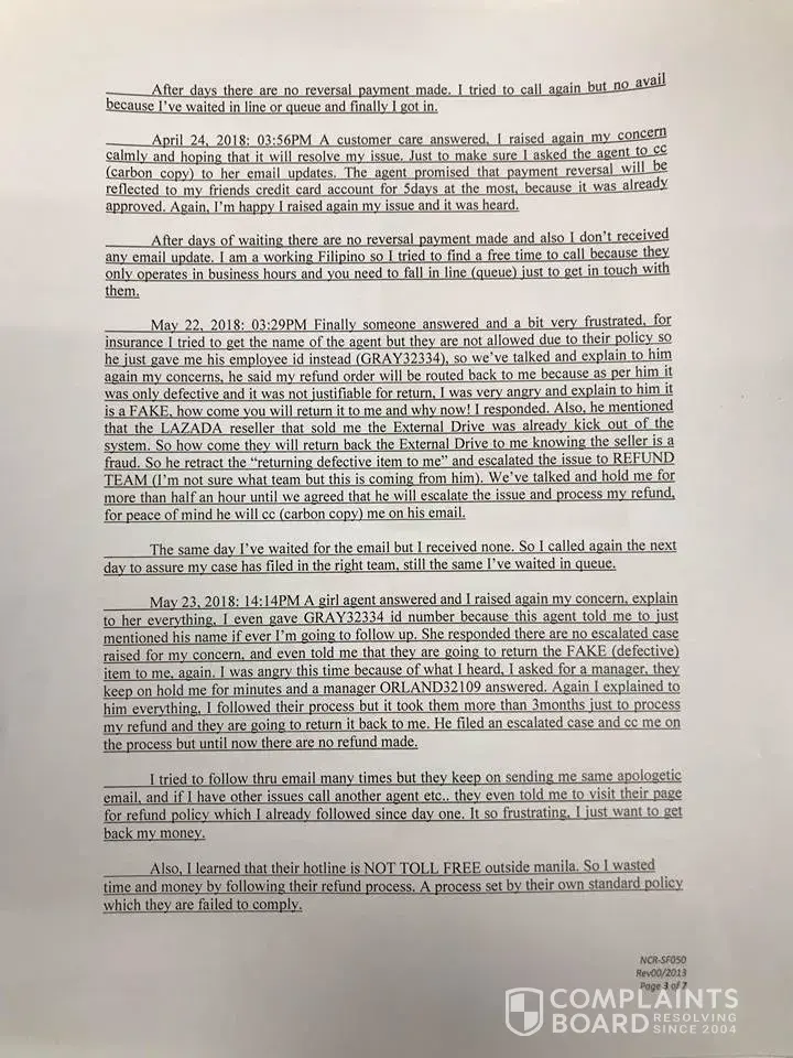 May 22, 2018: 03:29pm finally someone answered and a bit very frustrated, for insurance I tried to get the name of the agent but they are not allowed due to their policy so he just gave me his employee id instead (gray32334), so we've talked and explain to him again my concerns, he said my refund order will be routed back to me because as per him it was only defective and it was not justifiable for return, I was very angry and explain to him it is a fake, how come you will return it to me and why now! I responded. Also, he mentioned that the lazada reseller that sold me the external drive was already kick out of the system. So how come they will return back the external drive to me knowing the seller is a fraud. So he retract the "returning defective item to me" and escalated the issue to refund team (i'm not sure what team but this is coming from him). We've talked and hold me for more than half an hour until we agreed that he will escalate the issue and process my refund, for peace of mind he will cc (carbon copy) me on his email.