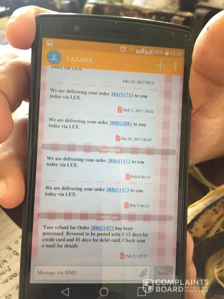 Hi we have same problem with this online [censored] shop. In my case, i ordered april 12 2018 until now no delivery of the item. I tell them to refund it if theyre not gonna deliver it. I make a daily follow up to the costumer service agent chat, and they always told me that theyre making action to my concern. But unfortunately until now, still i dont have the refund or delivery of the item. This online [censored] shop really sucks. They are cheating costumers, after you pay it with debit/credit card. They will not deliver your ordered item... Dont you guys order on this [censored] online shop! I am totally exhausted and disappointed with their seevice! F. U. LAZADA