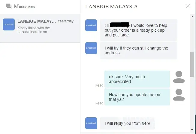 I have ordered an item from Laneigh Malaysia whereby the order number is #[protected]. Later on, I make a request for a change of shipping and billing address to Laneigh Malaysia whereby the Laneigh Malaysia rejected my request and told me that the item have been packed and sent. Hence, I'm expecting the parcel would be sending to the said shipping address and had arranged my friend to receive it. However, I received an email from Lazada Malaysia on the next day informed me that the item has been cancelled and refund process initiated. I'm so upset with it and make enquiries towards both Lazada Malaysia team and Laneigh Malaysia. The explanation given by Lazada Malaysia team was that the order being cancelled was due to shipping delay and can't arrive in expected date. I reverted to their message and stated that I don't mind to receive the parcel late. I also raised the question on the explanation given by them was contradicting with what Laneigh Malaysia given me previously. At the same time, I send a message to Laneigh Malaysia hoping they could resolve the said issue with Lazada Malaysia. No response from them. This is the worst e-shopping experience I ever had. I never want a refund but to get the product which I have purchased.