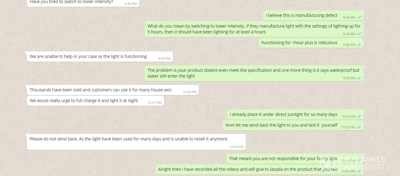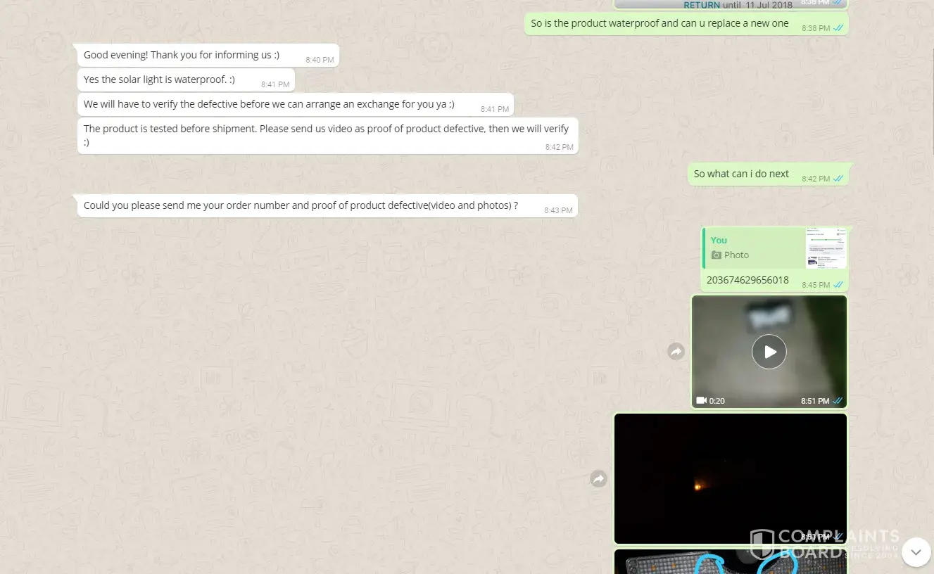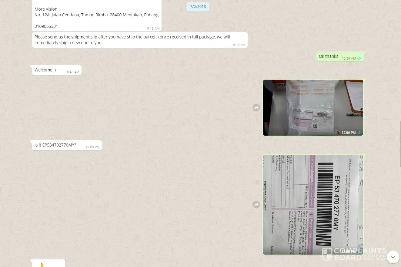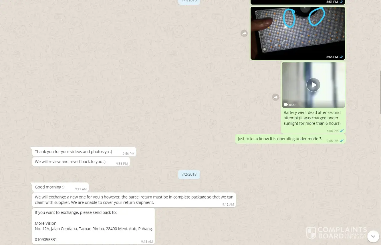 Hi, I have bought a waterproof solar light (order no: #[protected]) from MoreVision and received on 29 June 2018 and began to test out the light under mode 3 (which claim to be lighting up for 6-8 hours) on 1 July 2018 after full charge under direct sunlight. The light couldnt even light up for more than one minute and the LED indicator started to blink which means low battery so I request the seller, MoreVision to replace a new one. Fortunately, MoreVision allow me to return the faulty product after I provide them some videos and photos as a proof of the defective product. The product is returned to the address: No.12A, Jalan Cendana, Taman Rimba, 28400 Mentakab, Pahang provided by MoreVision on 2 July 2018.