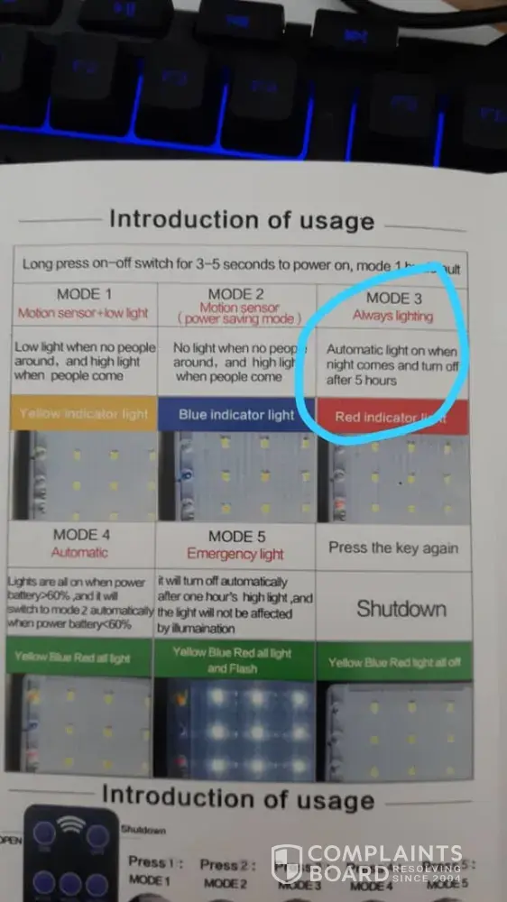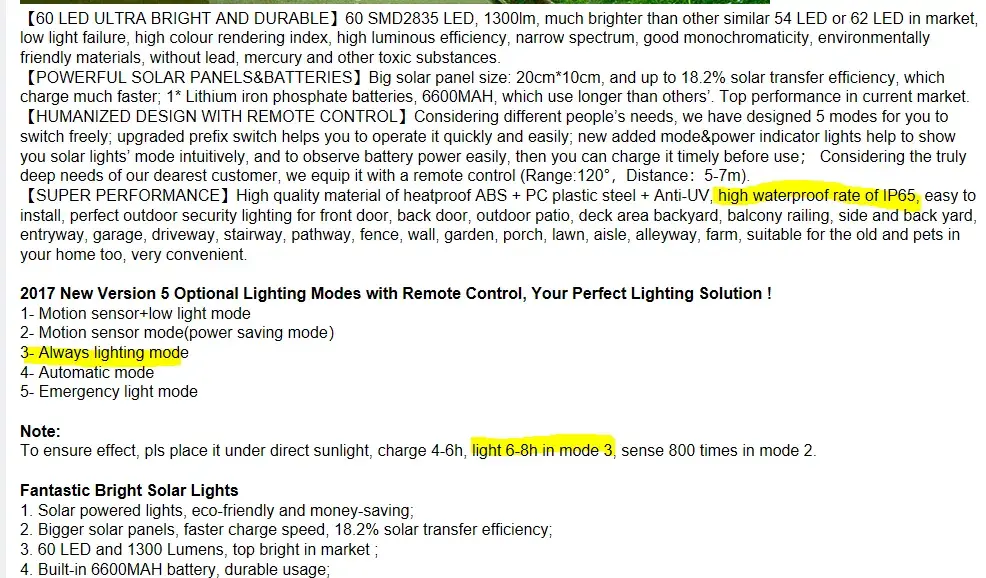 After one week, a new waterproof solar light has been sent to me and I began to test it under mode 3 for few days (13-15 july 2018) after full charge and it only last for 1 hour plus and the battery went dead again. I was very dissatisfied by the quality of the product and request MoreVision to test it out themselves so I request for another return. This time, MoreVision says they are unable to help anymore as the light is functioning and tell me not to send back as it already been use for few days and unable to resell it anymore. I am very dissapointed on the seller of their irresponsibilities for selling faulty products that doesnt even meet the specifications.