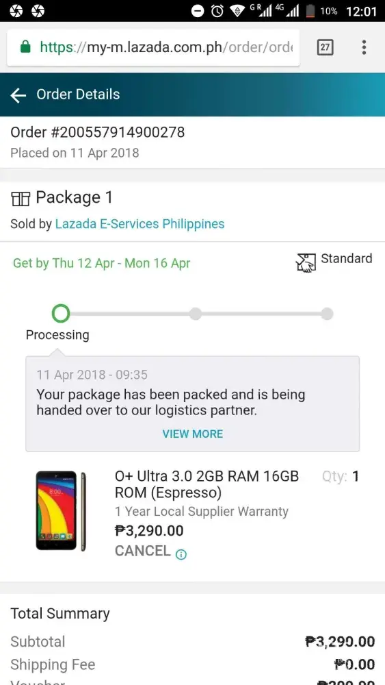 Thank you for contacting Lazada Philippines. You placed your order [protected] on 2018-04-02.