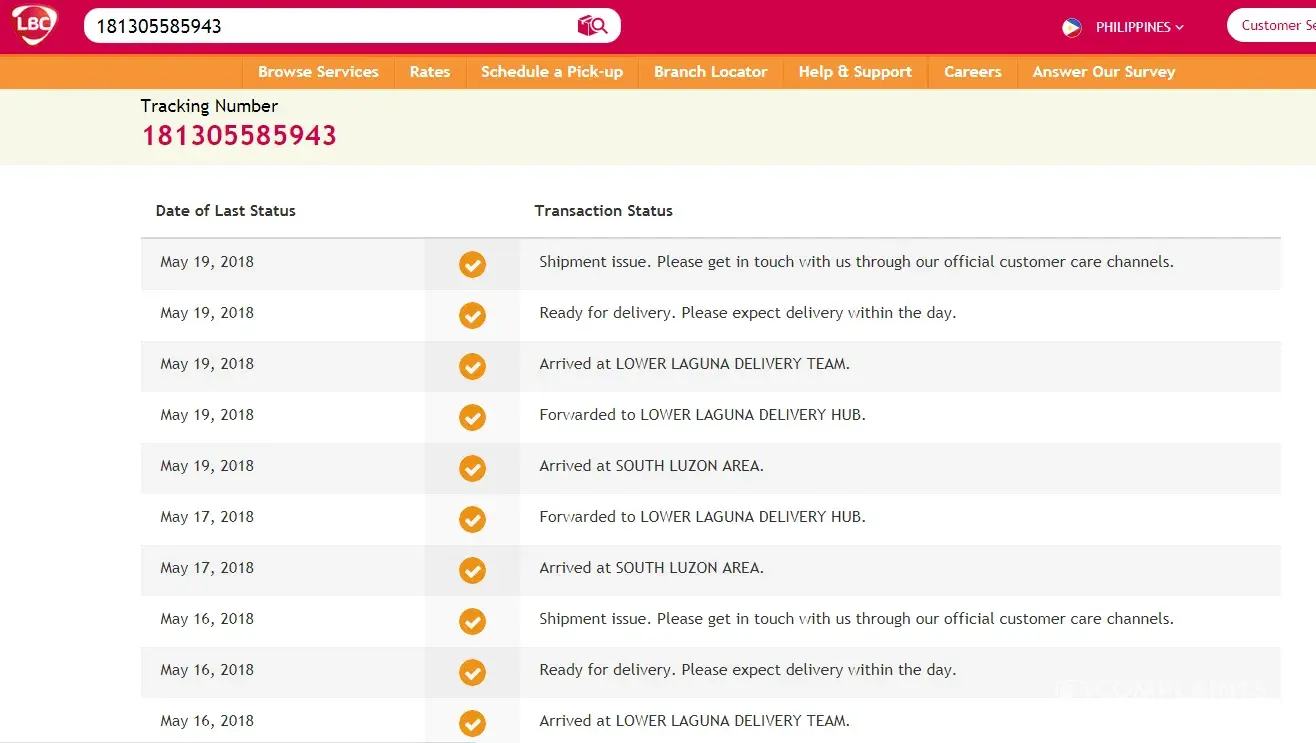 I called customer service 21st may and was informed the parcel was at lower south luzon hub in cabuyao, laguna. My instruction was to hold it there and I would get it myself. The customer service agent confirmed. I went the following day to cabuyao 21st may at 11am, and the personnel in charge said that it was routed to cavite fcie as of 19th may.