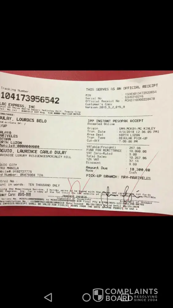 Greetings! I just want to file a complain to lbc mariveles bataan. April 9 when I ask may son to send money to my mother unfortunately that said money encash last april 25. However may mother (which is a 74 yrs. Old and had a prob.in walking) seems to be not threated fairly to think that she is a senior citizen already. This is what happened