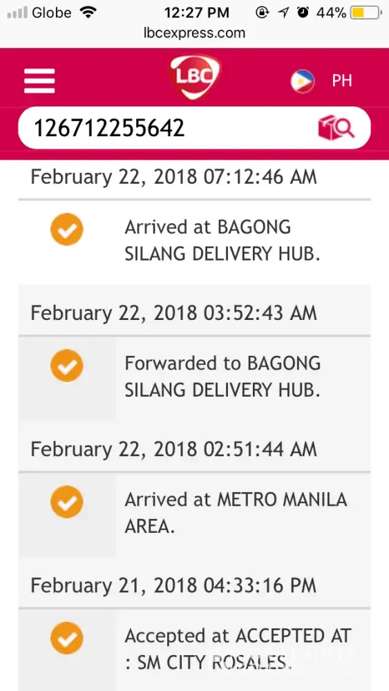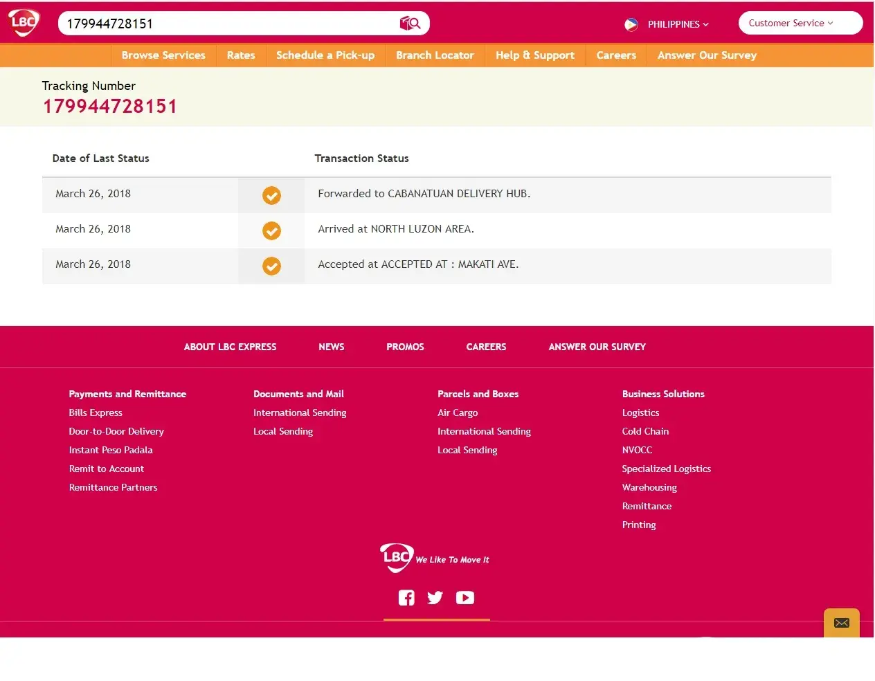 This is to follow up again the items sent from Manila last March 27, 2018 and according to the tracking data that said items with tracking number [protected] was already in LBC Calbayog City hub on same date March 27, 2018 at around 10pm but until now it's already April 2, 2018 the items are not yet delivered. Kindly respond and give immediate action on this delayed delivery. This caused so much inconvenience.
