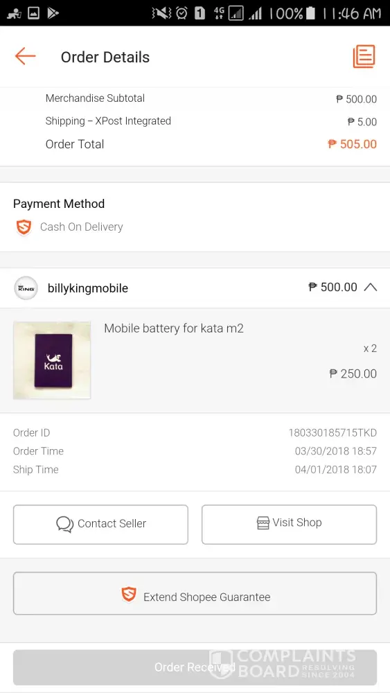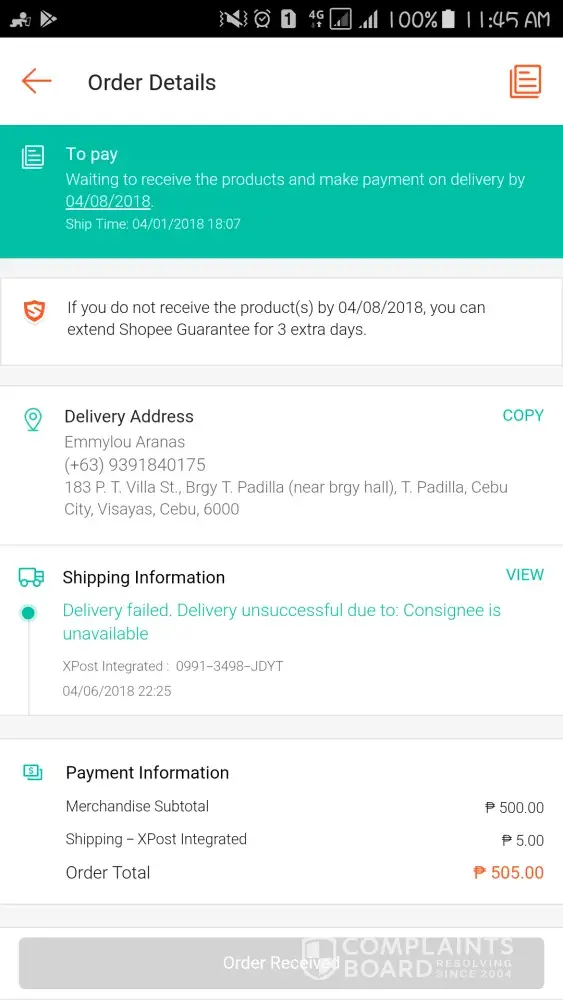 March 24, 2018 Your shipment was not delivered due to payment issues during delivery. Please get in touch with us through our official customer care channels.