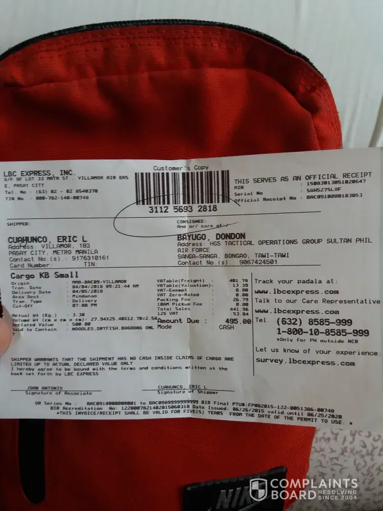 Cargo kb small, for sanga sanga, bongao tawi tawi from manila. Containing perishable items. It was assured to me by ms joan antonio of LBC villamor br that it will reach tawi tawi on 06 -07 april 18. But upon checking today it doesnt reach the destination. However, i called your customer care hotline and explained to me that the cause of delay is because the area is (islander). Ms joan antonio did not explained that to me. And now i would like to have a refund of my declared value. - this mr. Eric Cuajunco of 12-29st Villamor Pasay City. My cp nr is [protected]. I am hoping for a response coming from your good office. Thank you