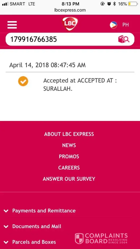 The LBC package was received in Makati Ave LBC on 26 March 2018 but till his time we did not receive any package nor a call from your delivery man, we visited this morning your office in San Isdro Nueva Ecija they told us there is already with delivery man we got the cp # of your delivery man but we call and text but he is not replying in our call nor our txt messages. here is his cp# [protected].