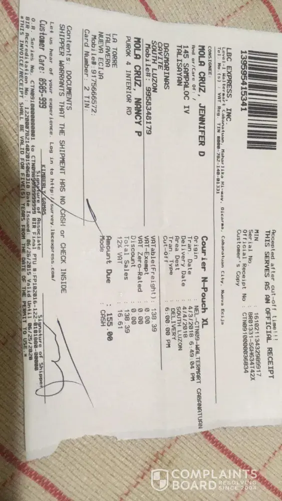 LBC Express the goods sent wasn't delivered on the date of pick up date that was stipulated on the receipt