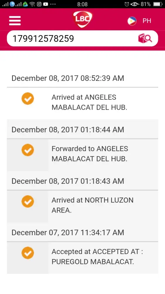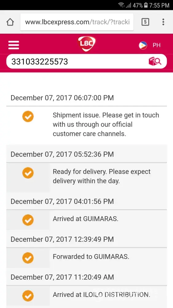 What happen? How come this would happen ...? On your tracking parcel on december 9 said expect delivery within the day then it couldn't happen theres no more delivery..the next day i went to lbc moalboal then they said ill wait for their text then it couldn't happen again ..then december 13 i track this morning and i found out shipment issue ..why?
