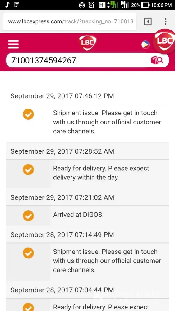 Hello, i'm kind of scared at this kind of situations so please follow up my item. The tracking number is #[protected], kahapon dapat madedeliver kaso hindi alam nung delivery guy kung san yung address, I replied 50 minutes later, but then it was too late. So please please please recognize this complaint. Namali kasi yung sender ng nalagay address nung una, tinawagan niya naman yung LBC and then she said the right address (sabi niya) kaso right now I think that wala na siyang pake dun sa parcel which is nakakainis. I sent the right address dun sa nagdeliver nung item ko kahapon, but then hindi niya na ata napansin, so please let this be resolved this week. Hays.