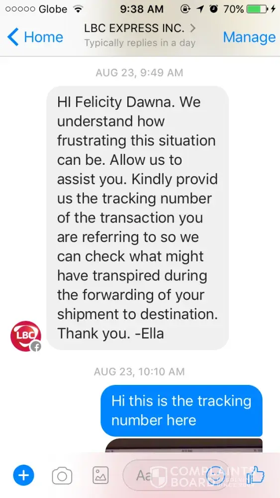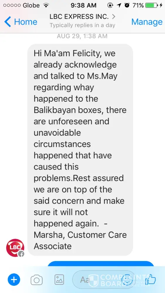 First of all, it has been more than a month since August 22 that we made the complains with regards to the TWO noticeable holes in one of the two boxes we received from my sister in States. I took a video of it and the whole process on how we opened it. A day after you read my post and messages in your fb, you then called me and told me that my sister should coordinate with you, and you even told me that you will have and investigations with regards to this. You even told me that you will compensate the damages of it. My sister wasn't really able to go right away because she was busy with work and it took her awhile to visit in your CA office where she sent the box with. Furthermore, she went to your office today and found out that you didn't even act upon it. She was just being told so, "YOUR FAMILY RECEIVED AND EVEN SIGNED THE BOX WHEN IT WAS DELIVERED, THEREBY IT WAS IN GOOD CONDITION WHEN THEY TURNED OVER AND HANDED IT INTO YOUR HOUSE." Now, let me ask your good hypothalamus, If you were in our shoes, would you bother turning all the sides of the boxes when receiving it?! I bet you won't. Honestly, we didnt really bother checking all the boxes because we didnt expect that we will receive a damage one. We even gave our FULL TRUST to LBC as a courier since my sister used to send with them for more than a decade. Nonetheless, you requested her to come to your office with all these documents. Every conversations we had through messenger were still here and I am going to screen shot everything! You don't have A WORD for all your clients. You are now claiming that it was our fault why the box had turned that way since we received it. Yes, we signed the receive form because it was your protocol to complete the transaction and with our full trust in your company, we didnt expect that it will happen to us. You are not even claiming that there are culprits and KAWATAN in your business. You kept on denying that you have been having staff who always do this kind of stuff to the packages hardly earned why the senders who entrusted you. Don't you ever think that you have to penalize and even convict those stealing the things in any packages being handed over?! You have to prove us that you still withold your CREDIBILITY and as what you are still claiming to be #HARINGPADALA! What a shame in your management for giving false reassurance of compensating the damages your staff had caused! Another thing, you told me when you called up that the holes were caused by the unpredicted clashing of boxes during transport but how come you are claiming now that we received the box in a good condition because we signed it?!? You even demanded me to remove my post because it is damaging to your reputation. Do you think I will remove it?! People deserves to know the truth about your messes!