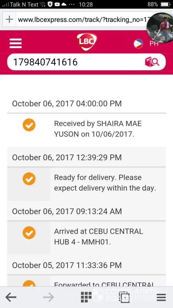 That moment na sabi ng kapitbahay na may nagtatanong daw ng pangalan ko na taga LBC kung sino at saan daw ang bahay ni Shaira Mae Yuson soo tinuruan ng kapitbahay ko sabi ng courier na kapitbahay nalang daw maghatid pero ang kapitbahay namin ayaw naman kasi d daw sa kanya soo tinuruan nalang sa bahay namin. Hintay ako ng hintay pero walang dumating na packaged. Pero positive padin ako kc close to 6pm na din at baka bukas nalang i dedeliver. Pero nakakainis lang na ng trinack ko Wow ahhh ang galing naman na received ko na daw yung packaged ko? Wow! Bukas puntahan q talaga LBC branch! Matanong kung bat ganyan. D pa naman yun COD at bayad na yung mga items ko na yun😑😢😢😢!
