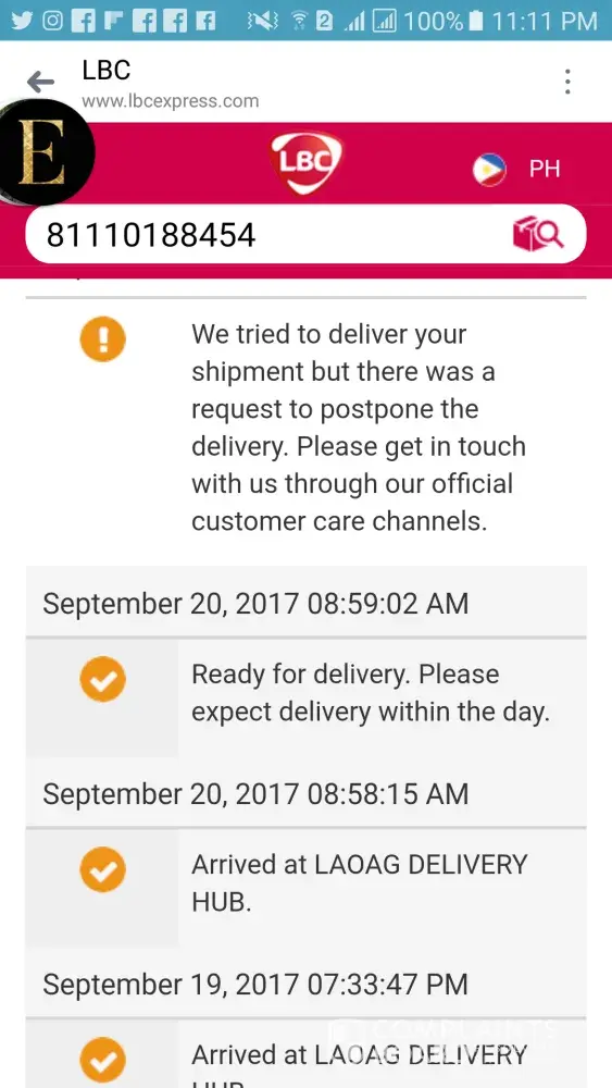 [protected] ayan po yung tracking number ko, september 18 po pinadala sakin ng sender yung item na yan, ang sabi po sa Lbcexpress SEPTEMBER 20 Ready for delivery. Please expect delivery within the day. naghintay ako buong maghapon kaso walang dumating then ang sabi "Shipment issue. Please get in touch with us through our official customer care channels."