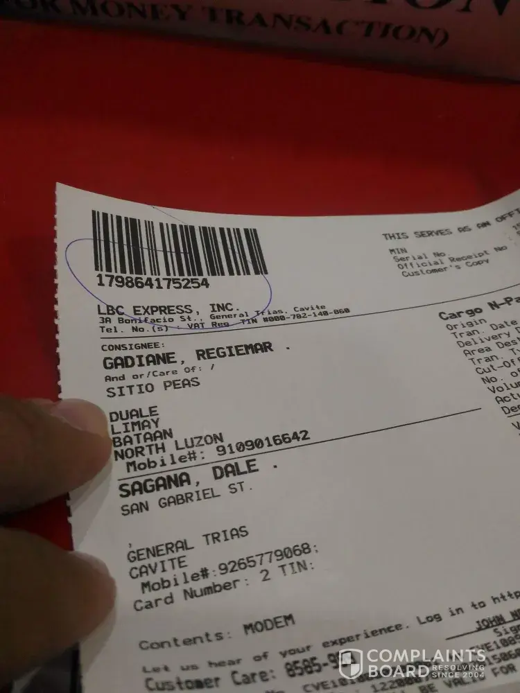 Madalas offline sa branch niyo dito sa trece martires city, cavite. About 11:20 am ako dumating sa lbc, inabot ng 11:55am hindi naprocess ang remitance ko. Konti lng nmn customer. Sa pag-iintay ko may nakasabay akong limang customer na kukuha din sana ng remitance. Nagtaka ako dahil thru lbc ang pinadalang pera n kukunin ko pero yun nagbayad ng meralco tinanggap. Offline dahil dahil wala daw connection PLDT. Lumipat nalang ako sa Palawan pawnshop dahil nainip na ako. Tinanong ko kung anong connection ng palawan, PLDT din naman. Nakapagtataka lang kaya baka pwedeng pakiinvestigahan. Masungit approach ng tao niyo sa branch. Sa inis ko, nagpicture ako ng pasimple..