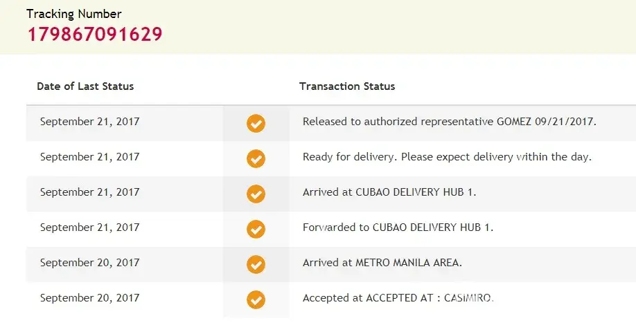 This sucks! They said they can deliver my item in a day so I trust this damn courier service. The transaction date was on Sept 18, 2017 but till Sept. 22, the day of my friend's flight to Kuwait they didn't make it in time to deliver. I tried to call them through their webtalk as many times as I could but nothing answer it and I tried to email them so many times and their Customer Relations Specialist, Jenny Rose A. Acorda who is also a worthless [censor], replied ounce telling telling that they are insuring the delivery on time but nothing happened, still my friend left for Kuwait without the shipment! I'm so dissapointed!