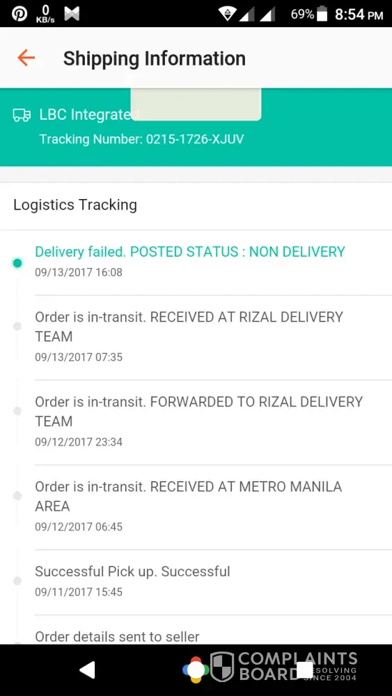 Nag order ako ng 32gb na sd card nung September 9, 2017. Ang expected day ng delivery ko ay September 17 pa pero bakit Failed ang Delivery Status(NON DELIVERY)? Wala namang kumontak sakin na taga LBC kung kailan dadating ang package ko tapos biglang nag failed? Gusto ko malaman kung anong nangyari kasi everyday ako nagchecheck ng logistics para matrack kung ano na ang nangyayari sa delivery. Wala namang dumadating na delivery boy sa bahay namin para masabing kaya nagfailed ang delivery eh dahil sa wala ako sa bahay and isa pa walang nagnonotify sa akin kung dadating na ba ang package dahil nga sep 17 pa ang expected day ng delivery. Gawan niyo naman ng paraan to LBC! NGAYON KO LANG NAEXPERIENCE NA GANITO YUNG NANGYARI SA INORDER KO! KUNG ALAM KO LANG DI NA SANA AKO NAGORDER! Ito yung tracking number ko [protected]-XJUV.
