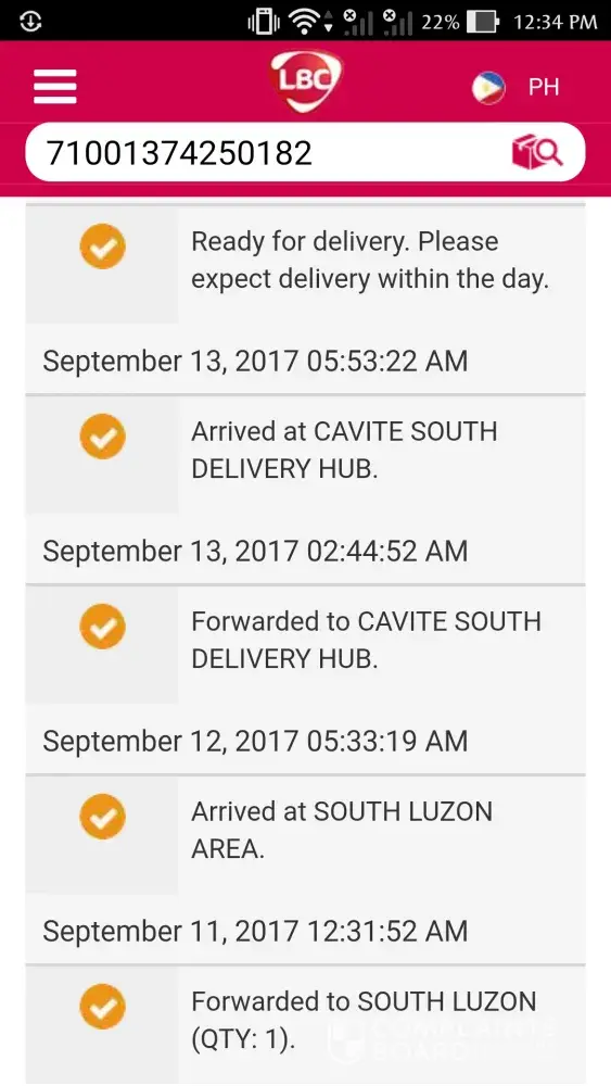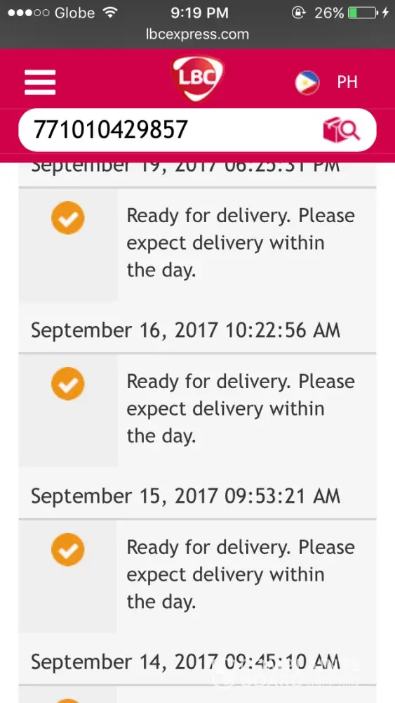 The parcel that I'm since yesterday haven't arrived. Naintindihan ko naman yung kapon kasi malakas ang ulan at madaming nabaha. Pero sana naman pag sinabi nyong madedeliver within the day ( today Sept. 13 ) ideliver nyo. Kanina pang 8 28 am naka out for delivery yung dalawang parcel na hinihintay ko . mag 7 pm na which is cut-off nyo na wala padin. Have some manners naman sana to call your clients kung di makakarating para di naghihintay sa wala. Yung parcel na yun gagamitin mamayang madaling araw. Umayos kayo lbc.