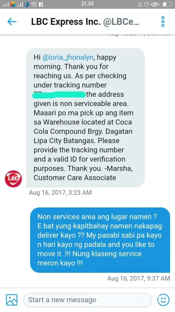 .LBC quoted "you like to move it" e bat ang sagot skin ng customer care nyo e. Kami pa ang kelangan pumunta sa warehouse nyo sa lipa para mkuha namin yun shipment namin is that how you give your service ? August 3, 2017 pa yung item namin dumating sa lbc and up untill now wla pa din puro sila dahilan . And ang last na sabi aakin non services area daw ang lugar namin and since when pa naging non services area ang lugar namin kng nkakapag deliver sila sa neighbor namin ? At wag ninyo sinasabi na mali ang adres na binibigay namin kasi simula dati pa yun na yung address na binibigay namin at lbc lang talaga ang hindi nakahanap sa addresa namin . Sa tagal kong ng follow sa shipment namin ang ending ang gusto nyo pa kami mismo ang kukuha sa warehouse nyo ! [protected] yan yun tracking number namin