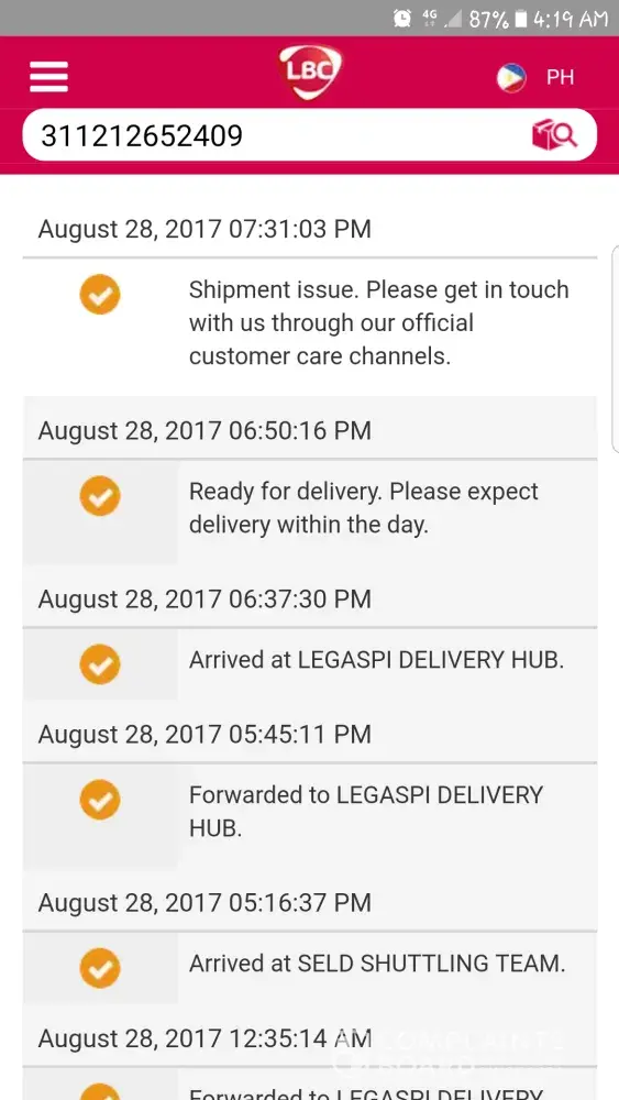 I was tracking the package I sent thru LBC to Polangui, Albay. August 28, 2017 it says it is ready for delivery and expect the the delivery within the day so I asked my Mom from Bicol to wait. The same day, it was tagged, Shipment issue. What is the exact issue? Can you tell me where the package is? Don't tell me that there is no LBC near the area because this is not the first time I sent a package from Ilocos Norte to Polangui, Albay (Bicol). Send me email for update. [protected]@gmail.com