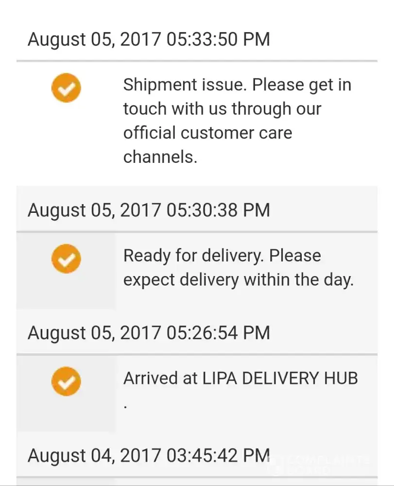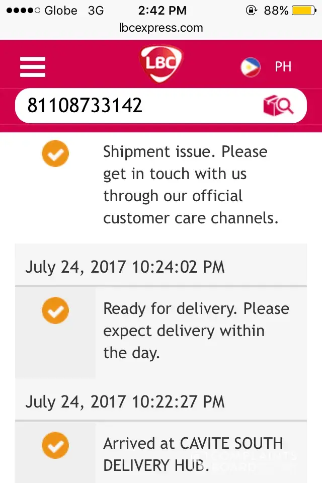 ..good day gusto ko lang po sana malaman what happened sa idedeliver sana sa aken. I check the LBC Tracking and it say"Shipment issue. Please get in touch with us through our official customer care channels" . Dapat kahapon Aug.3 2017 ko sya matatanggap pero di dumating. Last week naman po na deliver sa aken walang naging problema, same info naman po ang binigay ko like the address. The tracking number is [protected]