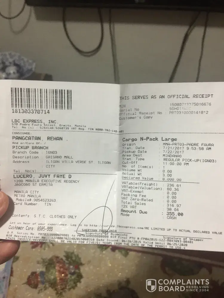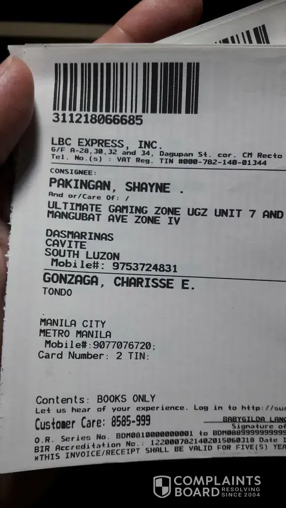 TRACKING #: [protected] . Wala sa ayos talaga serbisyo ng lbc, kaya nga pinalbc at nagbayad nag mahal n charge para mas mabilis ..cavite to manila lang ang 1 day naging 5 days na na paghihintay khit webtalk at email ganon dn useless kc no response at ggastos kapa ng tawag s landline s kkafollow pero wala dn nangyayari..matatapos n nman araw na to n wala n nman nangyari at hindi yan reason n sabihin nyo n lng araw2 n wala ng oras kcya hindi nadeliver kc binabayaran kau ng tama at imbes may importante me n pagamitan ng product...hindi ko na nagamit. Sarap talaga murahin mga taga lbc pag ganito kabagal serbisyo nyo!