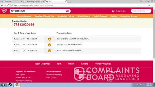 Third day today feb23, 2017 i personally dropped by s lbc robinsons place las pinas kung san ako ngpaship ng package around 5pm kc nga ala nmn call sakin reg dun s update n dpt ibbigay sakin ni sir eric de vera ng customer service but still gnun prin ang response.