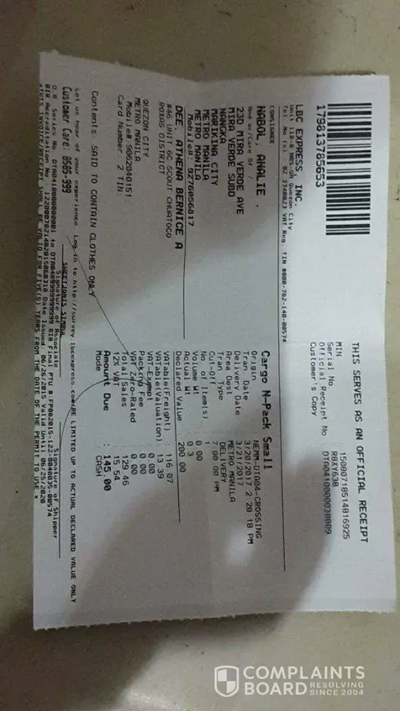 Raffle tickets were sent to Camacho, Joel R. in Ormoc City Public Safety Company, Camp Jorge Downes on Feb. 3, 2017 under tracking# [protected] but were not received by Mr. Camacho as of this writing. When I made follow-up with LBC Lower Bicutan where the items were sent on Feb. 21, 2017, they told me the reason of incomplete address. LBC Lower Bicutan contacted LBC Ormoc City to facilitate the sending of the said items to the consignee or if it not possible returned the item to the shipper as per my request. LBC Lower Bicutan gave the number of LBC Ormoc City team leader and when I talked to her she told me that it was received by a guard in the said camp. I requested her to text to me the name of the one who received and when it was received but to no avail. Mr. Camacho also made follow up to LBC Ormoc City then he was advised that I should write my complaint because their team will be shouldering the liability. The raffle tickets are worth Php10, 000.00.
