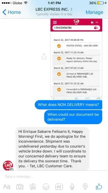 I communicated LBC through Facebook Chat, and only to find out that the delivery vehicle broke down. We understand this undesirable circumstance, but it could have been very helpful for us to look for other means of delivering our documents if LBC notified us. They have our numbers.
