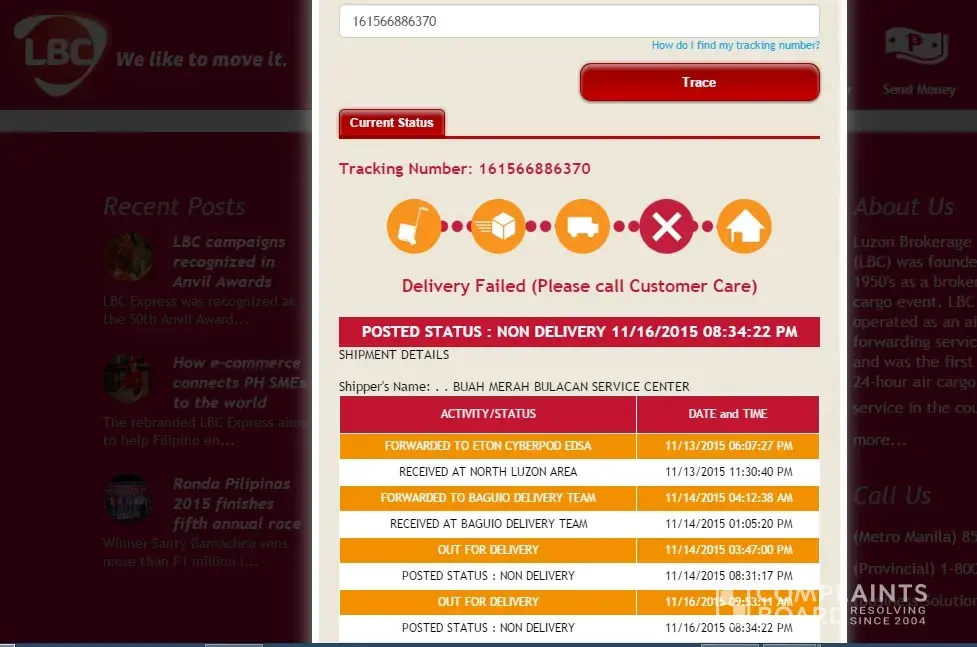 LBC Express Baguio has not yet delivered my expected package upto now. It has been in Baguio since the 14th of November 2015 but according to their tracking record as I checked, it has been out for delivery for so many days now. This is the tracking # [protected]. I need my package asap. Why is it taking it so long, to consider that I have always been receiving packages through LBC. Infact just around 2 weeks ago I received balikbayan box from Saudi. So there is no reason that they can't deliver or locate my home. It's so disgusting because my last package from Saudi, they called up and asked me if I would pick it up. My goodness! A very big and heavy balikbayan box, they expect me to pick up when in fact delivery fee has been paid? They're insane>>>> LBC Express, do something!