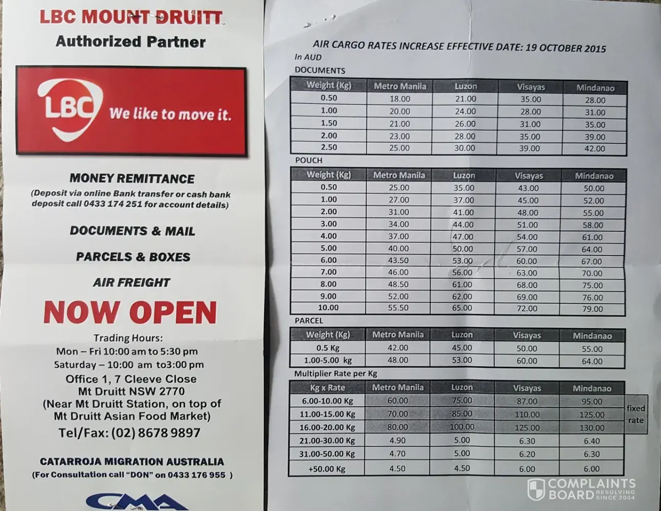 LBC in Mt. Druitt has a leaflet explaining charges for delivery but they charge extras which is not indicated in the leaflet. This is clearly misleading the people . Also when you send a particular amount they ask you to send it in separate remittance so they then charge you for separate fee. This needs to be investigated . I will advise other people who wish to send thru LBC to find other honest options . I have attached the leaflet that they give people and it clearly does not indicate extra charges such as i.e. insurances I have tried this service hoping they are straight forward but very disappointed. I sent a small box to philippines they charge me 77 AUD when the small box only weigh less 1 kgs. Anyway all I can say is extra charges should be clearly indicated even if it is a small tiny print. This will be the last time I am dealing with LBC