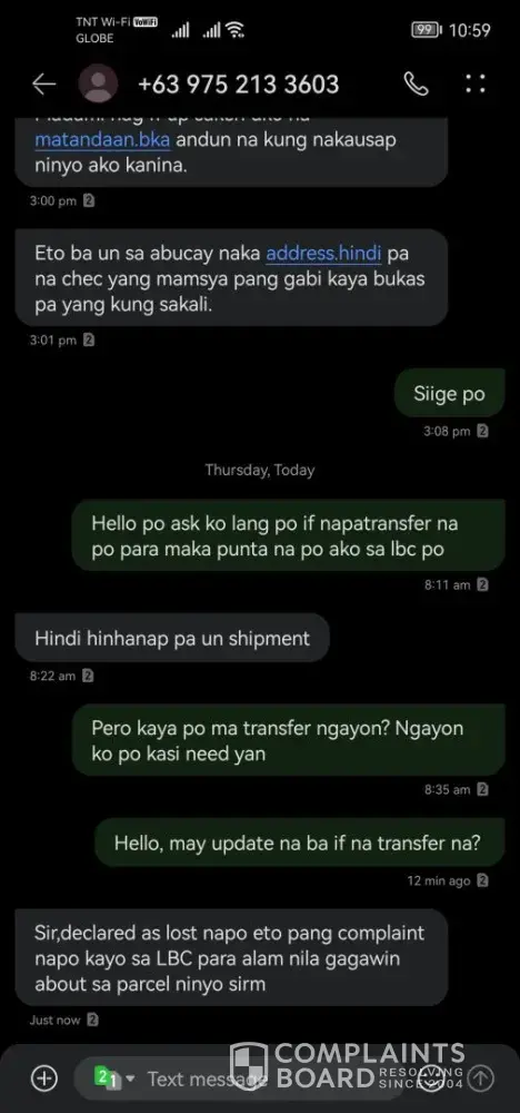 I am filing a complaint for failure of LBC to deliver a parcel [protected]. It was received by branch on 05 November 2025. Until now it is undelivered. Parcel is from Paranaque to Bacoor City