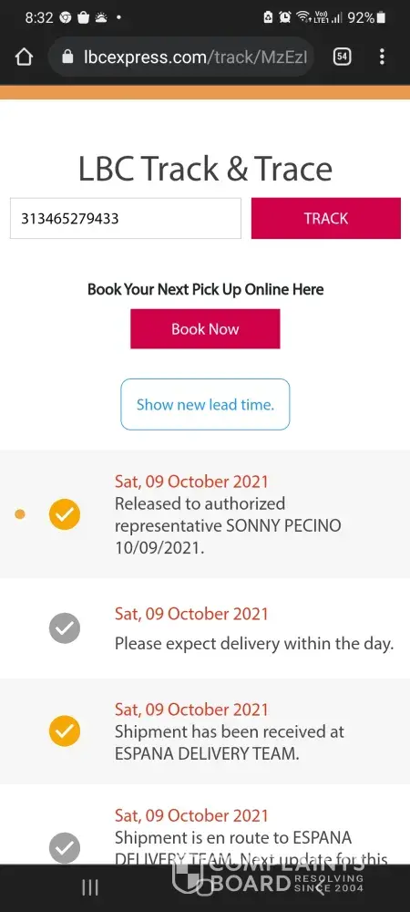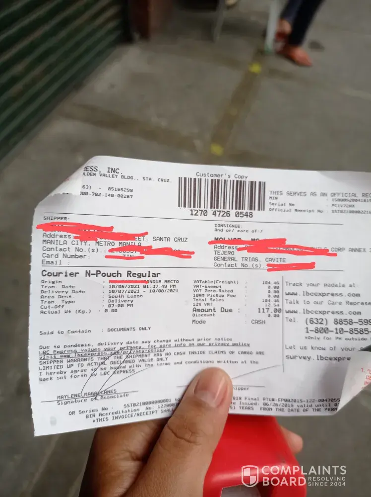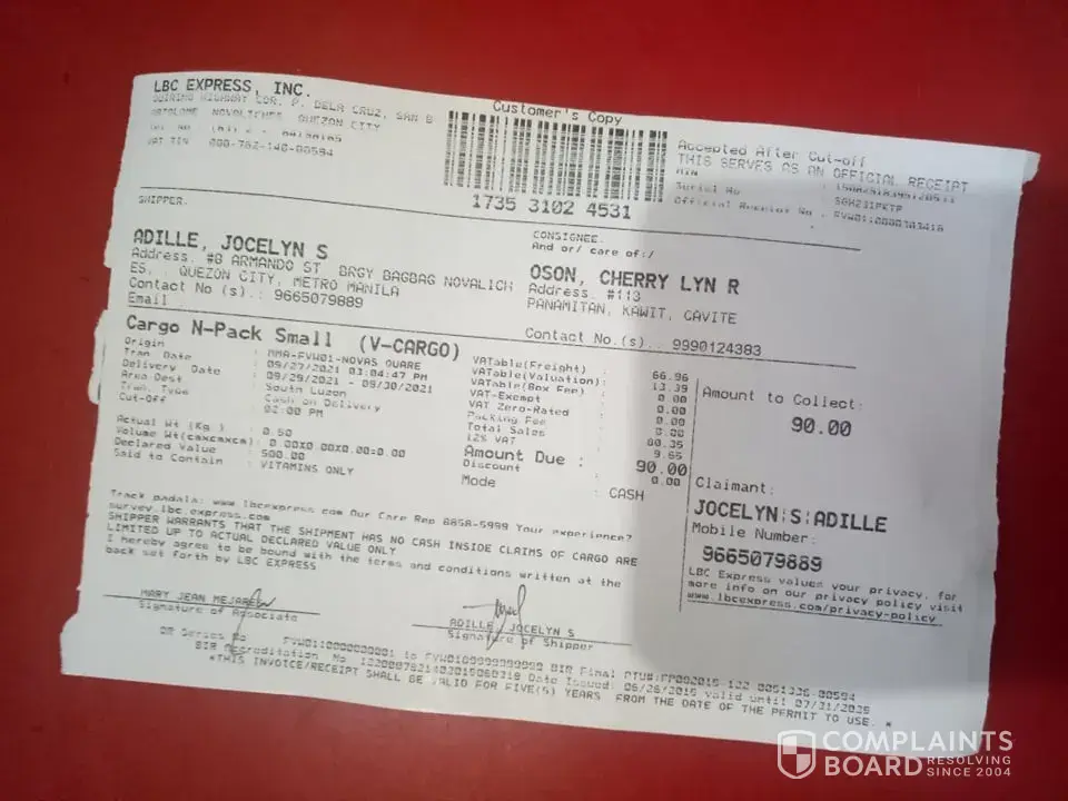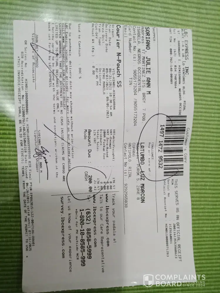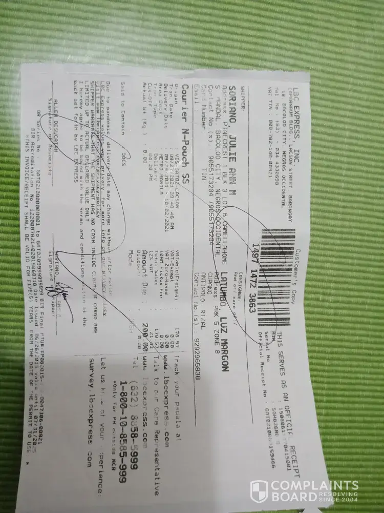 October 12, 2021 i left home at 1:00 pm to accompany and attend the court hearing of my niece in Mandaue trial court. I arrived home around 8:00pm already. In the midnight before I slept i tried checking and there I saw the tracking record and confirmation that it was DELIVERED to me 10/12/2021. This morning I asked our compound if there was any delivery made yesterday for me - NONE. Although it is very unusual that they will say DELIVERED without even texting me or calling me re: delivery of LBC on the way. They even texted confirmation to the shipper at 4:20pm yesterday that item has been delivered to me? REally? To whom? Can your personnel show proof of who received it?