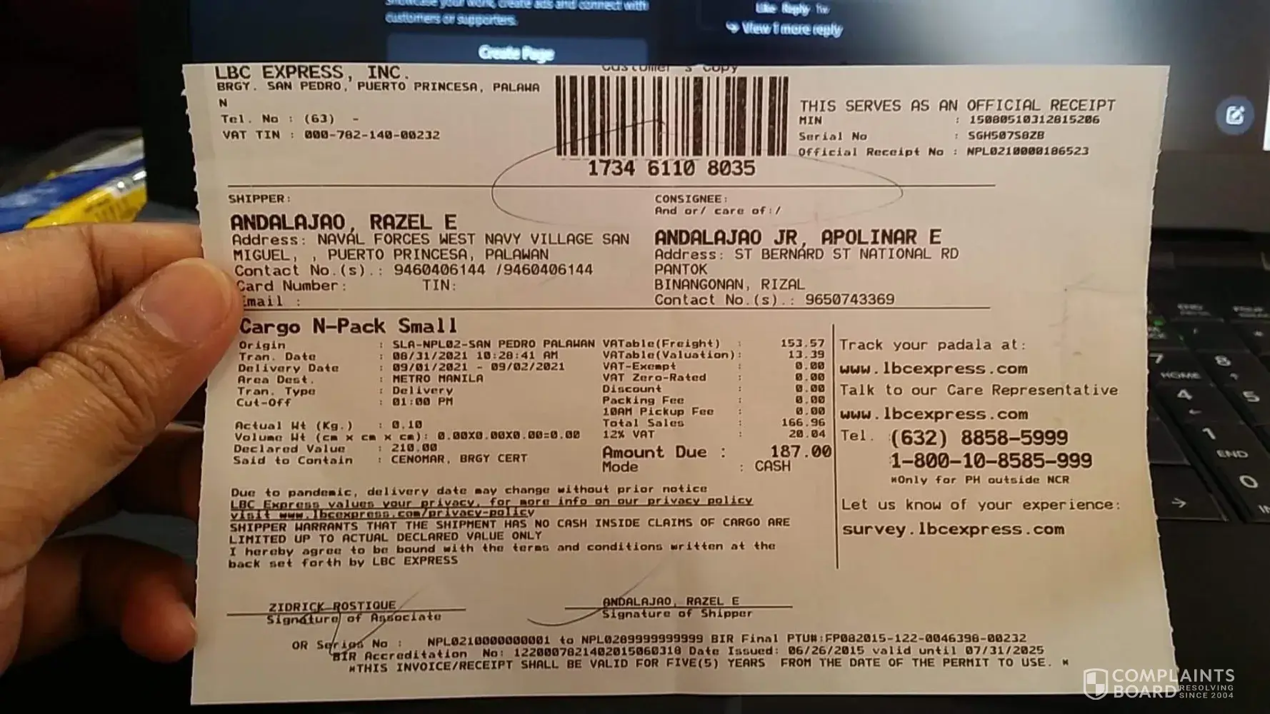 Gusto ko lang po ireport ang LBC puerto princesa palawan, kasi po pinadala po ng ate ko ang documents ko cenomar at brgy.clearance na kaylangan na kylangan ko po para sa philippine coastguard, pinadala po ng ate ko noong august 31 2021, na hanggang ngayon september 14 ay di parin po dumadating dito sa LBC pantok binangonan rizal sana po ay magawan po ng paraan at mapanagot po ang my pagkakamali po dito, maraming salamat po!