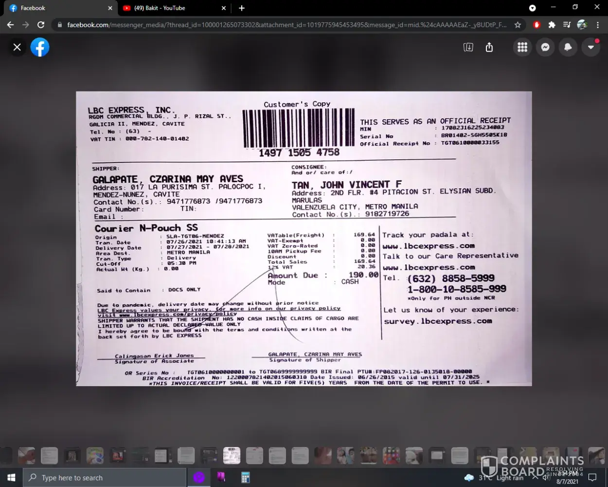 We sent the documents last July 26, 2021 @ LBC Galica II Mendez Cavite to Valenzuela City [protected]) It's been 14 days and the documents are still not there. Please help us! The document is important and urgent. We always follow up in LBC Mendez Cavite (your staff there is very rude) but no clear answer is given. We also msg and comment on facebook but still no response.