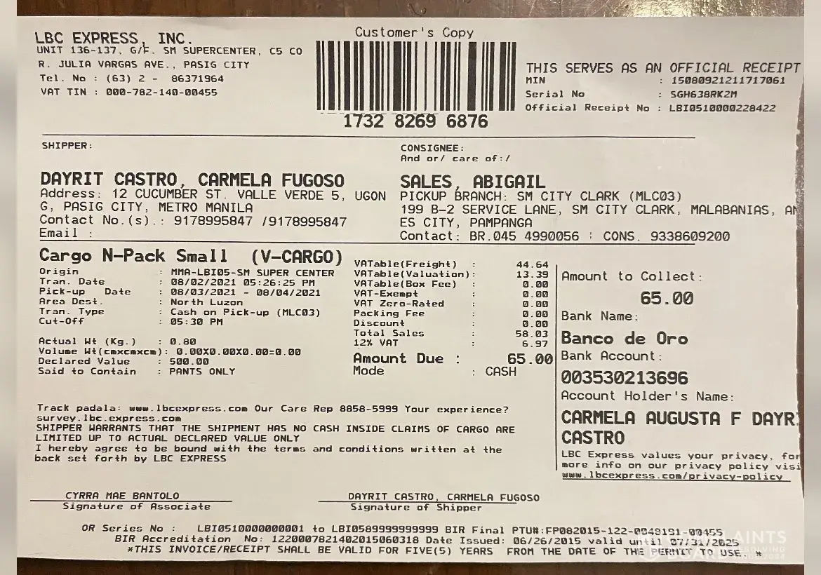 Staff in LBC SM CLARK doesn't want to release my package to the receiver just because her complete name is not written. First they told me to go back to branch of origin (SM HYPERMART PASIG) to give them receiver's middle name. So I did. NOW they want me to go back to the the branch to give the second name daw (ex. I put Abby de la Cruz and they want it to be Abby MARIE de la Cruz).. i don't think that is justified. This is a simple cheap package not