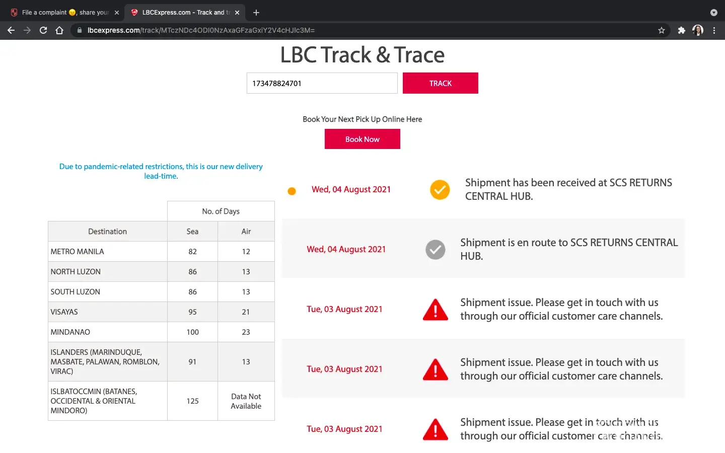 1. Shipment not received on stated date - At around 2:04pm on Aug 4, 2021, I received a call from family member from Dipolog city informing me that the shipment with tracking no. [protected] was not received. LBC Dipolog City branch informed her that shipment was still in Cebu. Transaction date was on July 29, 2021 at 12:43:36pm. Expected delivery date is 08/02/2021-08/04/2021.