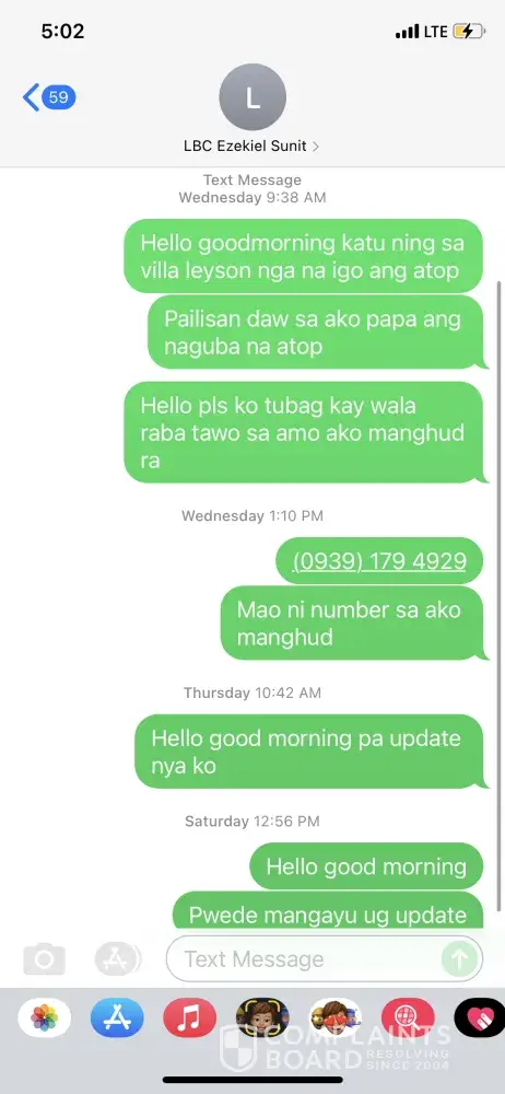 On June 15, 4:35 PM, LBC truck plate number AKA 2433 damaged the extension roof on our house at VLTD Block 3 Lot 1 Villa Leyson Bacayan Cebu City. LBC personel Ezekiel Sunit left his phone number and said he would come back to fix the damages the next day. I am no longer able to reach him by the cellphone number he left [protected]. Please contact me thru email as soon as possible [protected]@gmail.con or phone [protected]. Attached here with are th photos of the damaged area of the house, the delivery truck and the driver and my conversation with Mr. Sunit.