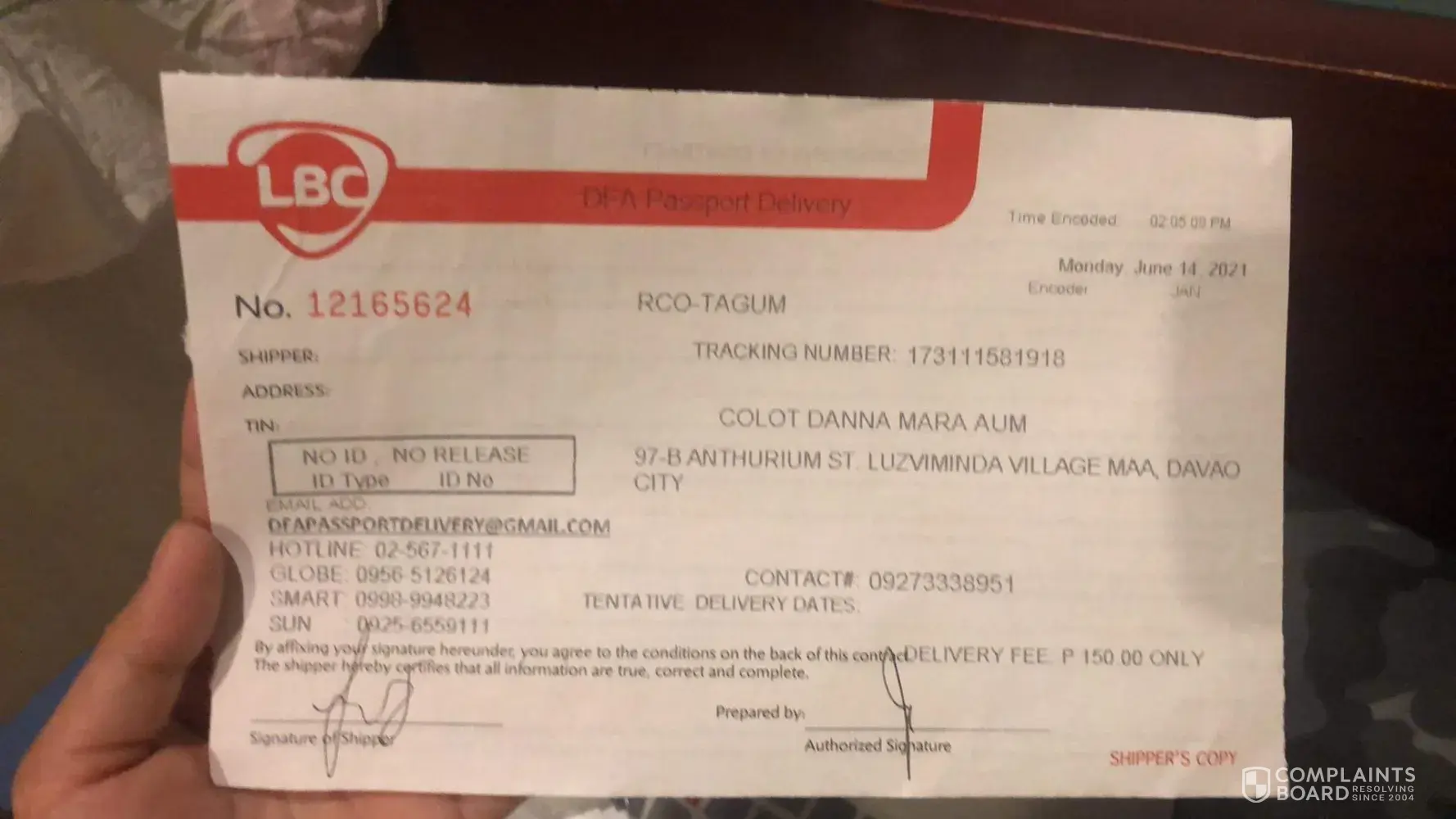 Hi! Department of Foreign Affairs Tagum City branch released my passport to LBC Tagum on June 22, 2021. I have been trying to search my tracking number on the website ([protected]) but it says "no records found". I consider this very worrisome because I have a flight on June 30, 2021 and I have not heard or received any updates from LBC Tagum. I will file a formal complaint and claim if I end up missing my flight because of this. My flight is worth $1000 and I was guaranteed by the LBC Tagum personnel that I will receive it before the said date.