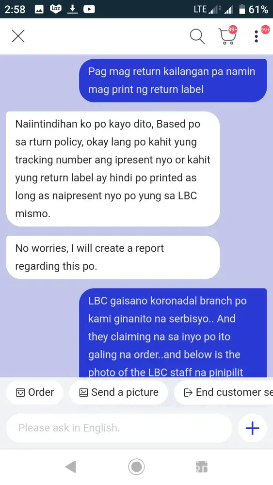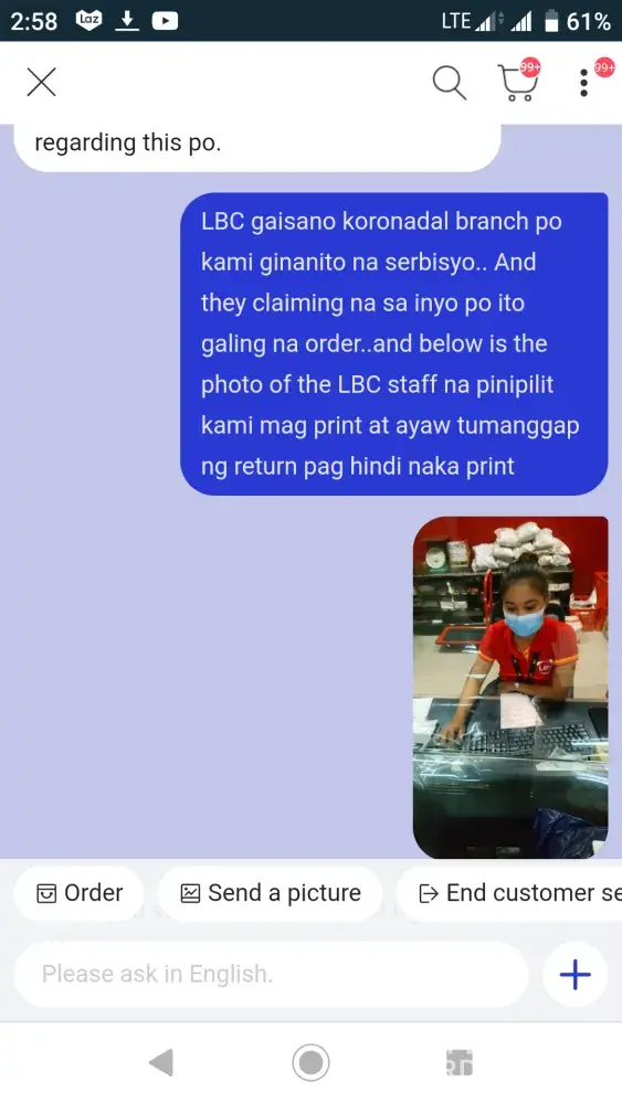 We have an item to be returned to lazada..we already have our return tracking number provided by lazada thru there online return form.. And instructed us to return it immediately at the nearest LBC branch.. And so we did we brought the item together with its tracking number to be presented at any LBC staff assigned..The bad experience arise when the LBC staff refuse to accept the return and telling us that lazada has its own protocol that whenever you return an item you should prepare a PRINTED TRACKING which is a FALSE STATEMENT.. lazada never ask a printed tracking instead only present the tracking number.. We are so disappointed on this kind of LBC EMPLOYEE.. Below are screenshot chat with lazada as proof that they never have that protocol as what the LBC employee is telling us about & a photo of an LBC employee we encounter