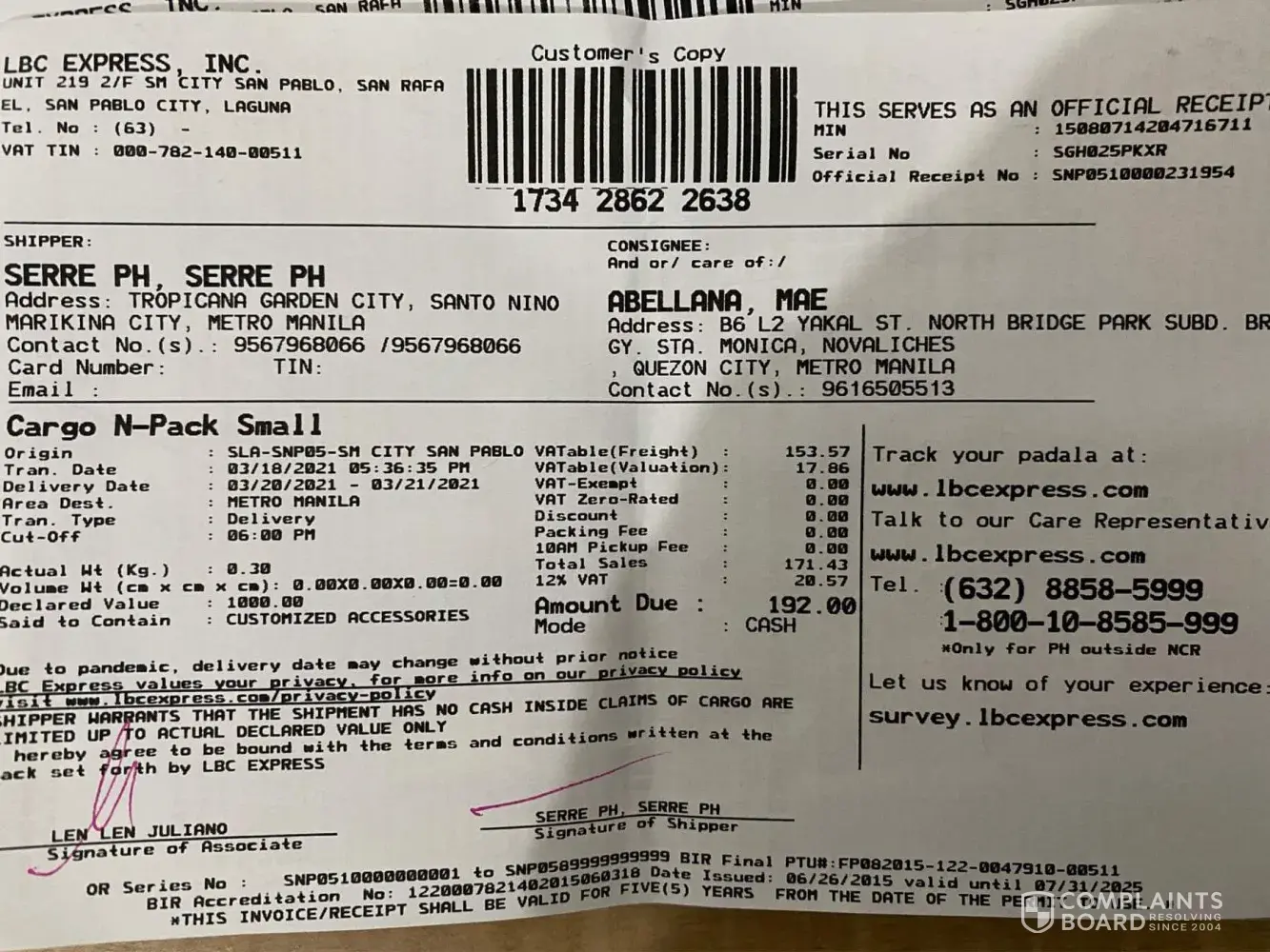 I hope you knock on the heads of your Quezon City branch head, staff, and delivery team because they are obviously not doing their job well. I ordered a sentimental piece from Serre and it was supposed to be delivered and handled well by your team. However, as fate would have it, the staff from Serre wrote the wrong address. The delivery guy and a woman from your QC branch called me and "assured" me that they will have the piece returned to Serre so it could be sent to the right address. However, days have already passed since that half baked promise was made. Serre has tried to reach out to your very irresponsible QC branch through their partner LBC branch (San Pablo) a lot of times, but the QC branch has not replied to any of their messages and return requests. Even phone calls are unanswered. I hope you work on this because that piece I've asked to be crafted maybe just an accessory for you but it's a part of me and honestly, your QC branch's irresponsibility is causing me too much emotional stress and anxiety. I hope you do live up to your tagline. You're the "Hari ng Padala, " right? I hope you can prove that that's not just some catchy phrase so you can rake in and deceive and cause emotional stress to your customers who placed their trust on you. I hope you act professionally and speedily on this.