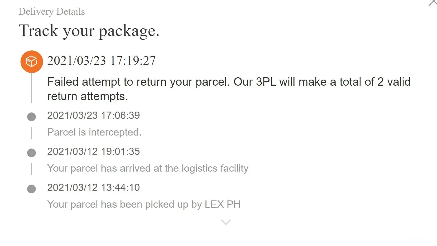 Failed attempt to return your parcel. Our 3PL will make a total of 2 valid return attempts.
