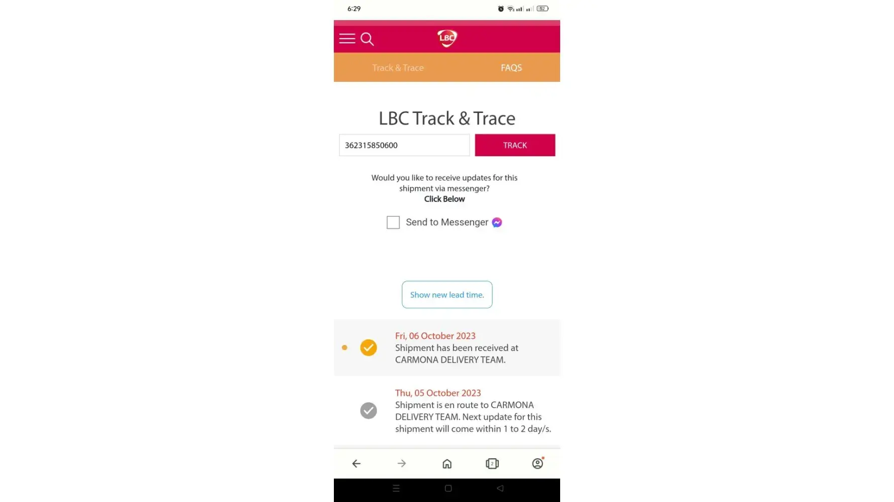 My receipt indicated that expected delivery date is October 6 to October 7, with tracking number 362315850600. I am trwcking my item thru their website and up to this date, it is still showing October 6, received wt Carmona Delivery team. I have file a complaint to their customer service numerous times and they would always tell me, check the status online and in the end, advised me to coordinate with the seller. This is the 2nd time that my item got missing and they are not holding themselves accountable with their poor customer service.